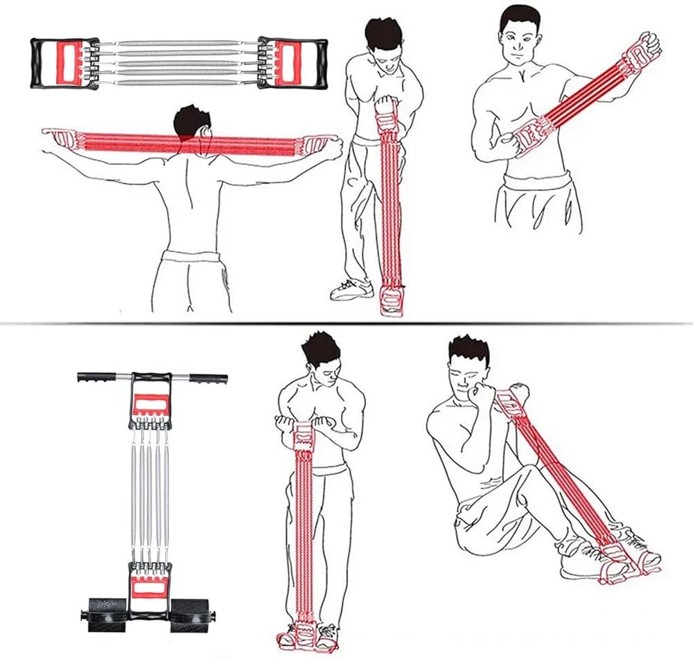 أداة شد عضلات الصدر بسوتسة، أداة شد البطن، أداة تماريد اليد 3 في 1، قضبان سحب سوستة مع 5 سوست معدنية، أداة شد الذراع والصدر، أداة تمارين لتقوية اليد